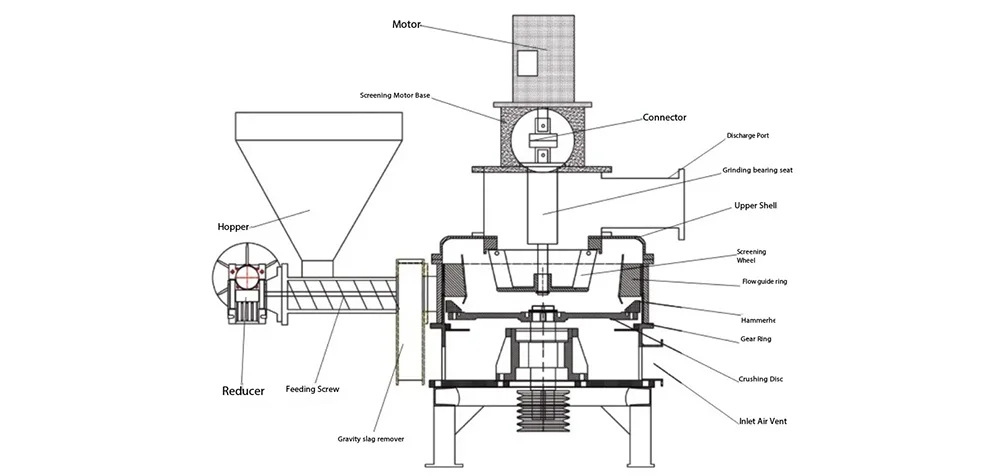 Der spezifische Verarbeitungsablauf ist einfach: Geben Sie zunächst das grobe Pulverrohmaterial mit einer Partikelgröße von nicht mehr als 10 mm in den Einfülltrichter und transportieren Sie es dann mit konstanter Geschwindigkeit durch einen Zuführer mit variabler Frequenz zur Brechkammer. Die Schleifscheibe in der Schleifkammer dreht sich mit hoher Geschwindigkeit, wodurch der Schleifhammer und die Schleifwalze synchron mit hoher Geschwindigkeit laufen, wodurch eine starke Zentrifugalkraft erzeugt wird und das grobe Pulverrohmaterial in die Innenwand der Schleifkammer geschleudert wird. Unter der Einwirkung der Zentrifugalkraft erleiden die Rohstoffe starke Kollisionen, Scherungen und Reibung mit verschleißfesten Auskleidungsplatten, Brechhämmern und Brechwalzen, wodurch die Vorzerkleinerung abgeschlossen wird. Nach der ersten Zerkleinerung wird das Material durch den vom Saugzuggebläse erzeugten Unterdruckluftstrom in die Klassierkammer befördert. Das Klassierrad in der Klassierkammer dreht sich mit hoher Geschwindigkeit, um eine genaue Klassifizierung entsprechend der Partikelgröße zu ermöglichen. Das ultrafeine Pulver, das den Anforderungen entspricht (Partikelgröße kann je nach Bedarf angepasst werden), wird durch den Luftstrom in den Sammler gebracht, um die Sammlung zu vervollständigen; Grobes Pulver, das die Anforderungen an die Partikelgröße nicht erfüllt, wird vom Sortierrad abgefangen und zur Nachzerkleinerung in die Brechkammer zurückgeschickt, bis es den angegebenen Partikelgrößenstandard erreicht, wodurch die Gleichmäßigkeit des fertigen Pulvers gewährleistet wird.
