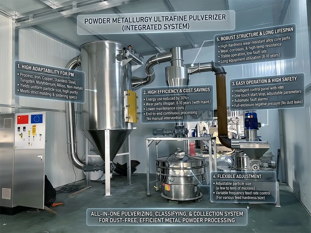 Das Kernarbeitsprinzip des ultrafeinen Pulverisierers für die Pulvermetallurgie besteht darin, grobe Pulverrohstoffe schrittweise in ultrafeines Pulver zu zerkleinern, das durch den synergistischen Effekt von Hochgeschwindigkeitsschlag, Scherung und Reibung die Anforderungen der pulvermetallurgischen Produktion erfüllt. Der gesamte Verarbeitungsprozess wird in einer geschlossenen Unterdruckumgebung durchgeführt, was sowohl umweltfreundlich ist als auch die Verarbeitungsgenauigkeit gewährleistet.