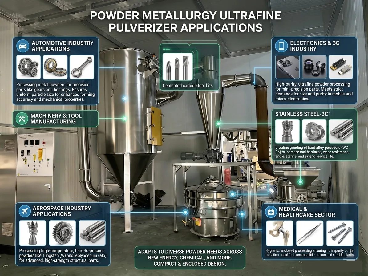 Der ultrafeine Pulverisierer für die Pulvermetallurgie wird hauptsächlich für die ultrafeine Verarbeitung von Rohstoffen in der gesamten Pulvermetallurgieindustrie verwendet und kann sich an die Zerkleinerungsbehandlung verschiedener Metall-, Legierungs- und Nichtmetallpulver anpassen. Es wird häufig in zahlreichen Bereichen eingesetzt, beispielsweise im Automobilbau, im Maschinenbau, in der Elektronik, in der Luft- und Raumfahrt, in der Medizintechnik und im Werkzeugbau. Die spezifischen Anwendungsszenarien sind wie folgt: